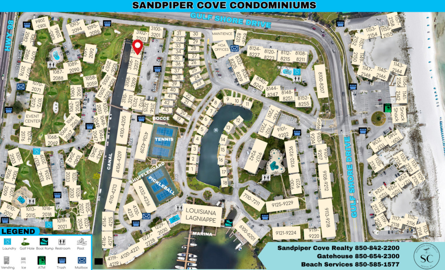 Welcome to Unit 3105, your tranquil first-floor retreat located within the scenic Sandpiper Cove resort in beautiful Destin, FL. This charming 2-bedroom, 2-bathroom vacation rental offers a perfect balance of relaxation and adventure, ideal for couples or small families looking for a memorable getaway. Step inside to find a tastefully decorated space featuring two bedrooms and two bathrooms. The open-concept layout includes a fully equipped kitchen, making it easy to prepare delicious meals. Enjoy your morning coffee or evening drinks on the private patio, where lovely views of the peaceful canal create a relaxing atmosphere. ๐ฝ KITCHEN Fully equipped kitchen with full-sized appliances Keurig coffee maker ๐ LIVING AREA Ample seating with a sofa sleeper Large flat-screen Smart TV Open layout extending to the patio ๐ฝ DINING AREA Open dining space adjacent to the living area ๐ PRIMARY BEDROOM King-size bed Flat-screen TV Plentiful closet space Private entrance to the patio Direct access to ensuite bathroom ๐ GUEST BEDROOM King-size bed Flat-screen TV ๐ BATHROOMS Master ensuite bathroom with shower/tub combination Guest bathroom with shower/tub combo accessible from living room and guest bedroom Provided amenities include shampoo, conditioner, body wash, hand soap, and lotion Luxury towels provided ๐ด BALCONY / PATIO / DECK Patio overlooking the canal with wildlife viewing Direct access from living area and primary bedroom ๐งบ LAUNDRY In-unit washer and dryer combo Laundry tabs supplied Sandpiper Cove Resort The resortโs amenities are exceptional, offering something for everyone. Spend relaxing days by one of five pools, or enjoy the private beach access for sunbathing and swimming. Golf lovers can play on the free on-site par-3 golf course, while tennis courts and pickleball courts are available for active fun. Try Bocce Ball or Shuffleboard, or cook out at the outdoor grills. For boaters, this unit offers convenient access to the Gulf of Mexico via the nearby boat ramp. Please note an additional fee applies to keep your boat in the water, which can be arranged with the resort directly. Trailer storage must be managed off-site. When venturing outside the resort, enjoy a variety of local attractions, including fresh seafood at local restaurants, boutique shopping, or deep-sea fishing excursions. After a day of exploring, return to your peaceful retreat. Relax in the community hot tub or take a leisurely evening walk through the beautifully landscaped grounds. Gather with loved ones for a barbecue at the outdoor grilling area, creating wonderful memories. Whether you seek relaxation or adventure, this vacation condo at Sandpiper Cove in Destin, FL offers it all. Book your stay today and experience the magic of Destin, where sun, sand, and serenity await. Sandpiper Cove Onsite Amenities ๐ Private Beach๐โโ๏ธ 5 Pools (2 heated) ๐ฅฉ Grills (located at pools and beach)๐ฆ 3 Hot Tubs โณ๏ธ FREE 3-Par Golf Course๐พ Tennis ๐ Pickleball ๐ฃShuffleboard โญ๏ธ Bocce Ball ๐ซด๐ปHorseshoes โ๏ธ Boat Ramp ๐ค Boat Parking ๐ฆ Louisiana Lagniappe ๐ Sand Flea (open seasonally Mar.-Oct.) โฑ Beach Service & Rentals (open seasonally Mar.-Oct.) Attraction / Area - Approx. Drive Time (times may vary due to traffic) Beach ๐ 1-2 minutes (FREE private parking available) Workout Anytime ๐๏ธ 3 minutes Winn-Dixie ๐ 3 minutes Target ๐ 3 minutes Luxe Nail Salon ๐ 3 minutes Publix ๐ 4 minutes Big Kahuna's Water Park (with a putt putt) โฑ 7 minutes Dog Park ๐ถ 7 minutes The Track (Go Karts) ๐ 8 minutes Walmart ๐ 9 minutes Destin History and Fishing Museum ๐ชธ 10 minutes Helicopter Tours ๐ 10 minutes Harborwalk (restaurants, shops, fishing, etc.) โด 11 minutes Destin Commons (Shopping) ๐๏ธ 11 minutes Sandestin Golf Course โณ๏ธ 12 mintues AMC Movies ๐ฝ 12 minutes Emerald Coast Wine Cellars ๐ท 17 minutes Gulfarium ๐ฌ 15 minutes Silver Sands Outlet Mall ๐๏ธ 17 minutes Baytowne Wharf (Shopping & Dining) ๐๏ธ 24 minutes Grand Blvd. Shopping Center (luxury shops & dining)๐ 20โ25 minutes Sacred Heart Hospital ๐จ 22 minutes Eglin Air Force Base๐๏ธ 35 minutes Destin/FWB Airport (VPS) โ๏ธ 30 minutes 30A Beaches ๐ 30-35 minutes Panama City Beach ๐ 1 hour, 18 minutes This condo includes: - Fully stocked kitchen - Spices - Cooking Spray - Aluminum foil - Ziploc bags - Paper towels (at least one roll) - Dishwasher pods - Dish Soap - Luxury towels and linens - Toilet paper (at least one roll per bathroom) - Beach towels - Laundry pods - Golf Clubs & balls Please note: -This condo is located on the second floor and does require the use of stairs. There is no elevator available in the building. -YOU MUST BE 25YRS OR OLDER AND STAY TO BOOK!!!!!!! -If the primary guest will not be present at check-in, at least one guest must be 25 years old or older to check-in. Please inform your host in advance so we can notify the gate and ensure proper accessย forย yourย group. -Each condominium is allocated only two parking spaces and two parking passes per unit. There is no assigned parking. -Beach Service is available from 1st of March until the 31st of October only. -To secure a boat dock space, please visit the Sandpiper Cove website and submit a request. Please note that there is a fee for renting dock space. Please be aware that trailers or boats cannot be parked inside Sandpiper Cove. For trailer, boat, or jet ski parking arrangements, we recommend contacting facilities in the Destin, FL area. -Sandpiper Cove is gated with 24 hour Security Guards for your protection. -NO SMOKING and NO PETS allowed inside the condo or on the balcony. Any violations will result in charges, automatic eviction, and forfeiture of refund. -This unit does not come with beach service. Although you can purchase beach service at the beach for an additional fee.