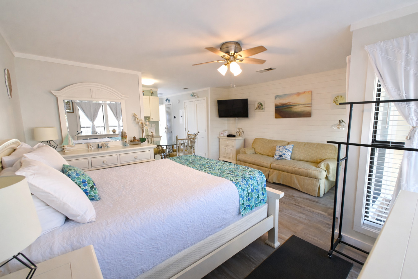 August 2025 5.00Our stay was excellent! The beach chairs/umbrella being included made it even better. I would recommend a more comfortable firmer mattress. The bed and pull out bed both make noises when you turn over, making it very easy to wake the other person up. Overall, we loved it!